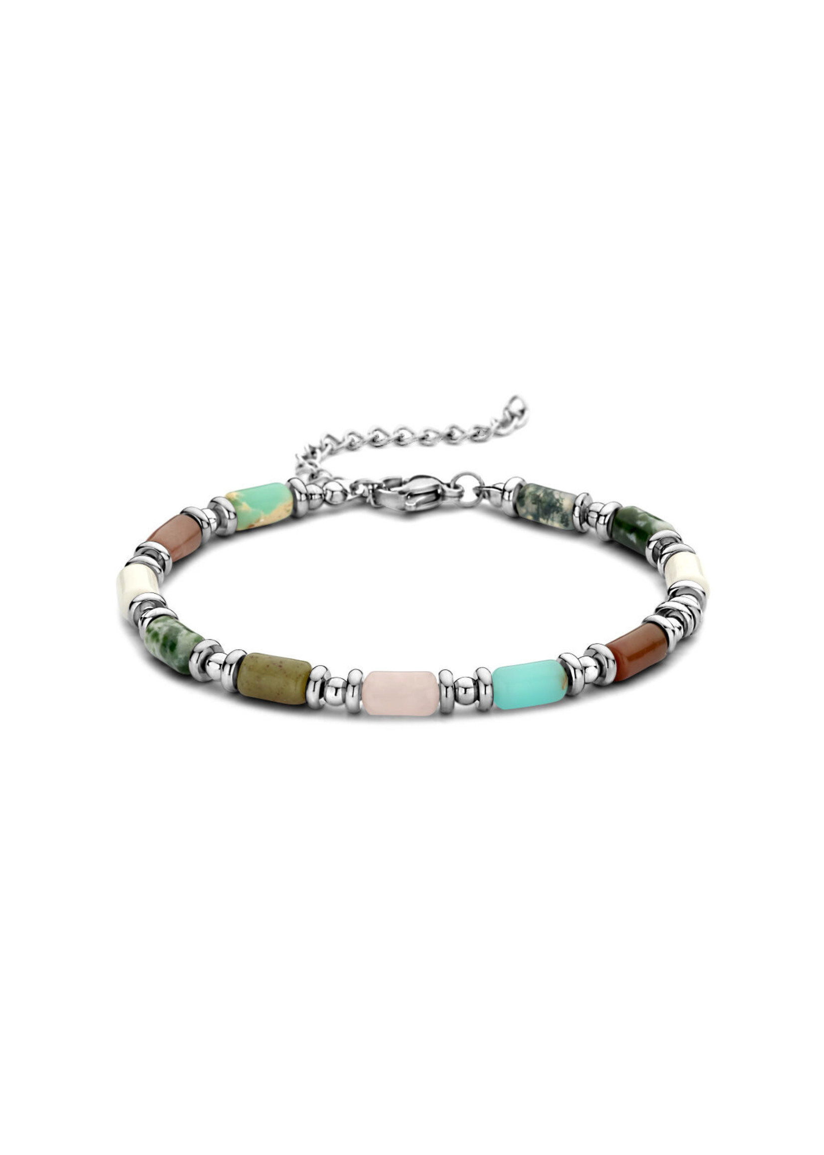 Stalen armband uitgevoerd met verschillende edelstenen zoals: howliet, roze kwarts, aventurijn, agaat en jaspis. De armband heeft een draaglente van 16cm met een extensie van 3cm en een karabijn sluiting.